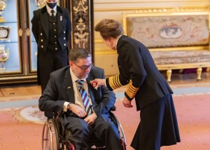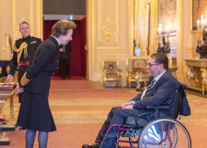 Recipients and guests were briefed on what to do. There were only 58 recipients that day, half the usual number. We were organised into a queue and shuffled down to a room adjoining the Grand Reception Room, where the investitures were taking place. We could hear the Army String Orchestra playing a mixture of classical and classic rock music. When it was my turn, I removed my face-mask and Helen and I were separated. I waited at the edge of the brightest and most richly decorated room I have ever seen and saw Princess Anne was chatting with the person who, just a moment ago, was waiting in the queue in front of me. I swelled with pride as the Lord Chamberlain read out my citation, “Mr Richard Christopher Brown Esquire MBE, for services to Disabled People and the Community of Middle Barton in Oxfordshire.” The Paige pushed me to the Princess Royal and stepped back. I bowed my head.