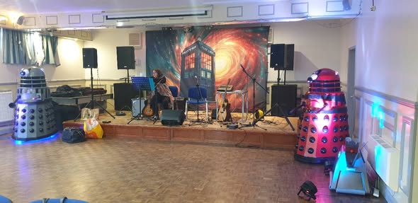 With a couple of weeks to go, we were starting to look at using cardboard cut-outs. I posted a desperate request for help in the Dalek Builders’ group on Facebook. Luckily for me, Tony Stewart, the owner of Who-Ray Dalek Hire, saw my plea and very kindly offered to bring his Daleks all the way down from Hull (took pity on a fellow sci-fi fan!). But why were the Daleks in Hull in the first place you ask? Well, Helen made me laugh when she explained that to some friends on the evening: “Hull is where all the Daleks live, they like it there because it’s very flat!”.